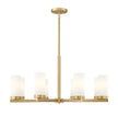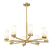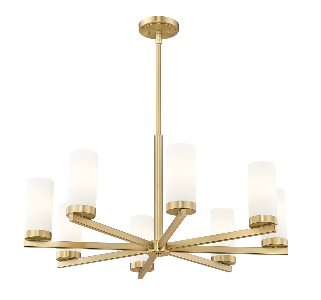 Set a soothing but sophisticated tone over your entry or dining table with a modern eight-light chandelier with a round silhouette and radial arms. It casts beautiful illumination with cylindrical shades in frosted white glass, offering a sense of balance against a warm modern gold finish over steel construction.