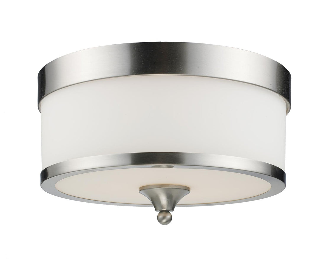 For a cutting edge modern fixture, look no further than this flush mount. A milk white shade is complimented with brushed nickel bands, and accented with a modern styled finial. This flush mount is sure to be great addition to any contemporary space.