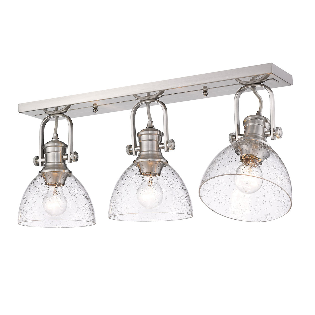 Bring farmhouse elegance into your home with the Yep by Golden Lighting Hines 3-light Semi-Flush Mount. Featuring a glass shade and a Pewter frame, it creates a welcoming atmosphere. The seeded glass shade is characterized by small, infused air bubbles that create a distinctive, antique-inspired texture. This beautiful, clear glass shade adds a touch of vintage character and artisanal charm to your space, gently diffusing the bulb's glow for a warm ambiance. The Pewter finish offers a soft and classic alternative to brighter silver tones, creating an elegant, non-glare glow that brings a touch of traditional charm. Perfect for entryways, bedrooms, kitchens, and living areas with mid-height ceilings, this fixture is Damp Location Rated, making it suitable for covered and semi-enclosed spaces with occasional moisture. With adjustable directional heads, you can customize the lighting to highlight specific areas. Overall Dimensions: 23.13"W x 10.38"H x 6.88"D. Requires 3 E26 Medium base bulbs (not included), max 60 wattage per bulb. Enhance your living space with this chic fixture that seamlessly blends style and functionality, ensuring high-quality illumination for years to come.