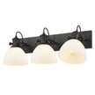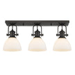 Bring vintage-inspired elegance into your home with the Yep by Golden Lighting Hines 3-light Semi-Flush Mount. Featuring an Opal Glass shade and a Rubbed Bronze frame, it creates a welcoming atmosphere. The Opal Glass shade diffuses light evenly, offering a soft, glare-free glow that enhances any décor. Its milky, translucent white color evokes both timeless charm and modern sophistication. This popular Rubbed Bronze finish brings classic warmth to any design, featuring subtle highlights of warm, coppery bronze. It complements various styles, from traditional farmhouse to industrial. Perfect for entryways, bedrooms, kitchens, and living areas with mid-height ceilings, this fixture is damp location rated, suitable for spaces with occasional moisture. Customize your lighting direction with adjustable directional heads, allowing you to highlight specific areas or objects effectively. Overall Dimensions: 23.13"W x 10.38"H x 6.88"D. The fixture requires 3 E26 Medium base bulbs (not included), with a maximum wattage of 60 watts per bulb. Elevate your home with this charming fixture that effortlessly balances style and practicality, while providing a warm and inviting glow.