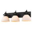 Bring traditional elegance into your home with the Yep by Golden Lighting Hines 3-light Vanity in Matte Black and Opal Glass. Featuring an opal glass shade and a matte black frame, it creates a welcoming atmosphere. The opal glass shade provides a beautiful, luminous glow, designed to diffuse light evenly for a soft, glare-free experience. Timeless and elegant, its milky white color enhances the overall charm. Our matte black finish is both versatile and sophisticated, offering a smooth, non-reflective surface that complements various decor styles from minimalist to contemporary. Suitable for damp locations, this fixture is perfect for bathrooms, covered porches, and laundry rooms. The adjustable directional heads allow you to customize the lighting to highlight specific areas or objects. Overall dimensions are 25.13"W x 8.75"H x 8.25"D, and it requires 3 E26 Medium base bulbs (not included), with a maximum wattage of 60 per bulb. Add a touch of authentic vintage charm to your space with this remarkable fixture, crafted from quality materials for lasting beauty.