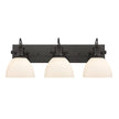 Bring Traditional elegance into your home with the Yep by Golden Lighting Hines 3-light Vanity in Rubbed Bronze and Opal Glass. Featuring an Opal Glass shade and a Rubbed Bronze frame, it creates a welcoming atmosphere. The Opal Glass shade is designed to diffuse light evenly, providing a soft, glare-free glow, perfect for enhancing your space. With its warm Rubbed Bronze finish, this fixture offers timeless appeal and a beautiful depth that complements a variety of styles. Brighten up bathrooms with dedicated lighting that flatters while providing practical task illumination, suitable for covered and semi-enclosed spaces like bathrooms or laundry rooms. Adjustable directional heads allow you to customize the lighting, and it requires three E26 Medium base bulbs (max 60 watts each) for illumination. Overall Dimensions: 25.13"W x 8.75"H x 8.25"D, elevating both style and quality in your home.