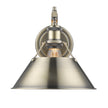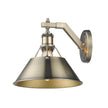 Embrace vintage industrial elegance with the Yep by Golden Lighting Orwell 1-light Wall Sconce. Featuring a metal shade and an aged brass finish, this sconce introduces character and warmth to any space. The low-luster satin sheen of the aged brass provides a tactile quality that beautifully diffuses light, adding depth to your decor. This fixture is designed with a nod to utilitarian aesthetics, ideal for those who appreciate vintage charm. Perfect for hallways, stairways, and bathrooms, this wall sconce is damp location rated, ensuring safety in areas with occasional moisture. With overall dimensions of 10"W x 9.63"H x 11"D, it requires one E26 Medium base bulb (not included) with a maximum wattage of 100. Reinvent your space with this stylish, functional lighting solution that enhances both ambiance and style.