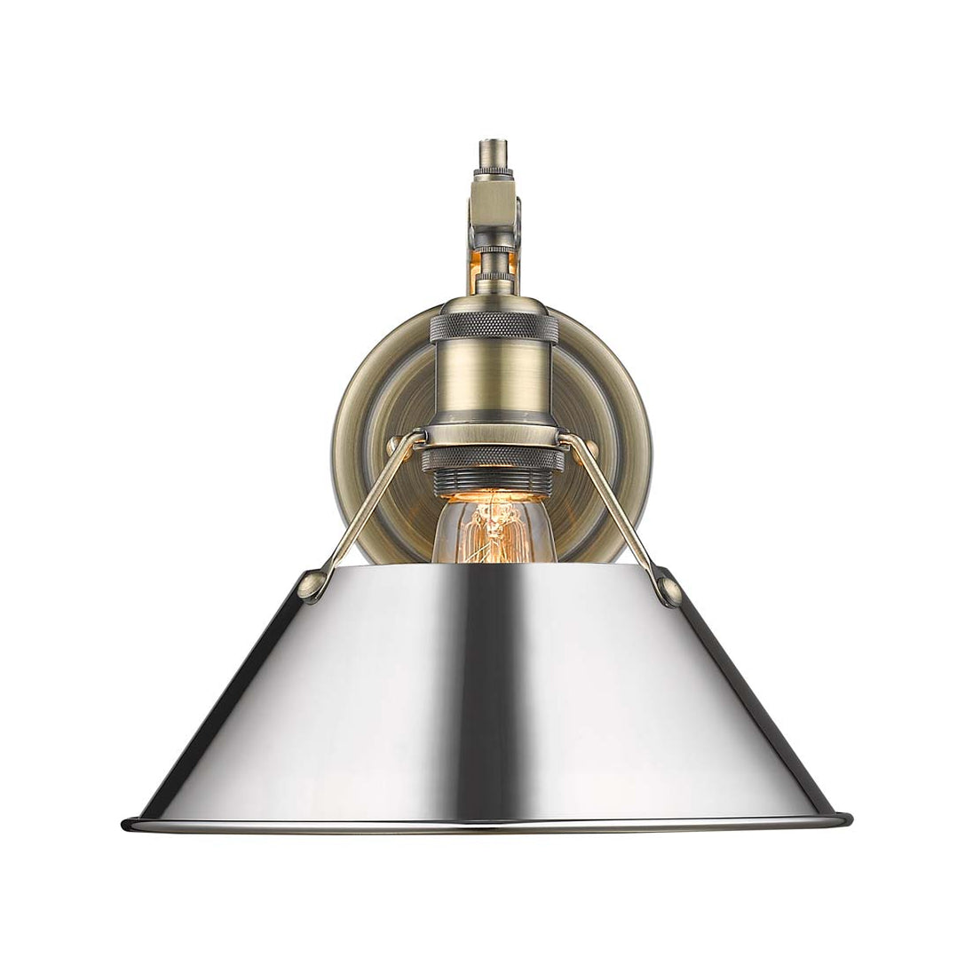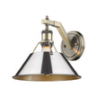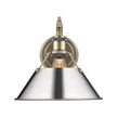Bring industrial elegance into your home with the Yep by Golden Lighting Orwell 1-light Wall Sconce. Featuring a Metal shade and an Aged Brass frame, it creates a welcoming atmosphere. The Metal shade shines in a stunning Polished Chrome finish, offering a highly reflective surface that amplifies brightness, making it a timeless addition to any decor. Embrace timeless elegance with our Aged Brass finish, reminiscent of vintage hardware and heirlooms. The durable electroplating process not only enhances its beauty but also ensures longevity. Ideal for hallways, stairways, or to introduce charm in bedrooms and dining areas, this sconce is Damp Location Rated, making it suitable for covered and semi-enclosed spaces. Overall Dimensions: 10"W x 9.63"H x 11"D. Requires 1 E26 Medium base bulb (not included), with a maximum wattage of 100. Add a touch of brightness and polished perfection to your home with this stylish wall sconce.
