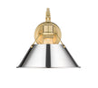 Bring industrial elegance into your home with the Yep by Golden Lighting Orwell 1-light Wall Sconce. Featuring a metal shade and a Brushed Champagne Brass frame, it creates a welcoming atmosphere. The metal shade shines with a polished Chrome finish that offers a sleek, mirror-like quality, enhancing the light's brilliance and sophistication. Our Brushed Champagne Brass finish blends the warmth of brass with the softness of silver, perfect for a contemporary style. Suitable for enhancing hallways, stairways, and bathrooms, this fixture is Damp Location Rated, making it ideal for spaces with occasional moisture. It requires installation and utilizes a single E26 Medium base bulb (not included) with a maximum wattage of 100. With overall dimensions of 10"W x 9.63"H x 11"D, this light fixture provides ample illumination and makes a lasting impression. Close with a lifestyle appeal and quality that ensures timeless beauty.