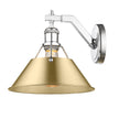 Bring industrial elegance into your home with the Yep by Golden Lighting Orwell 1-light Wall Sconce. Featuring a metal shade and a chrome frame, it creates a welcoming atmosphere. The metal shade, finished in Brushed Champagne Brass, showcases a muted brassy-gold color with soft satin luster and fine directional brushing that exudes modern sophistication. Brilliant and timeless, the polished chrome finish offers a crisp, clean look that suits any decor style with its high-shine gleam. Ideal for hallways, stairways, and bathrooms, this fixture is Damp Location Rated for covered and semi-enclosed areas. It requires 1 E26 Medium base bulb (not included), max 100 wattage, with overall dimensions of 10"W x 9.63"H x 11"D. Enjoy the perfect marriage of style and utility with this exquisite piece.