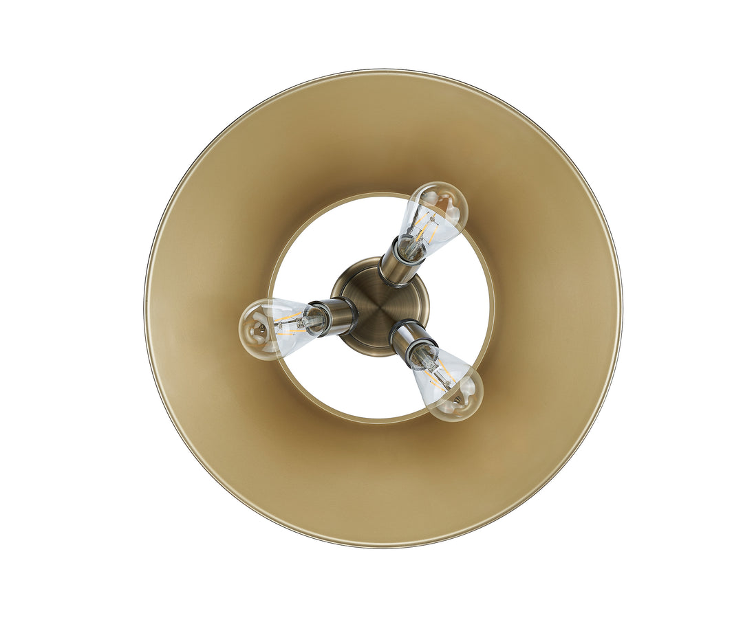 Bring industrial elegance into your home with the Yep by Golden Lighting Orwell 3-light Flush Mount. Featuring a metal shade and an aged brass frame, it creates a welcoming atmosphere. The Brushed Champagne Brass metal shade showcases a muted, brassy-gold color with a soft satin finish, providing a chic and versatile ambiance. Embrace timeless elegance with our Aged Brass finish, which is achieved through a durable electroplating process, adding depth and character to your space. Ideal for low ceilings in hallways, closets, laundry areas, bathrooms, and more—its damp location rating ensures safety in moisture-prone areas. Overall Dimensions: 18.75"W x 9.25"H x 18.75"D. Requires 3 E26 Medium base bulbs (not included). Max 60 watt per bulb. Experience the perfect blend of contemporary style and quality craftsmanship with this versatile fixture that complements a range of decor.
