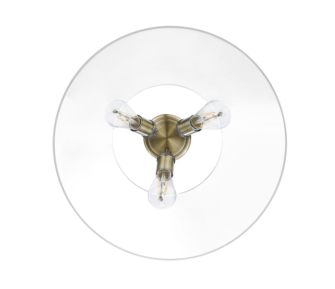 Bring industrial elegance into your home with the Yep by Golden Lighting Orwell 3-light Flush Mount. Featuring a clear glass shade and an Aged Brass frame, it creates a welcoming atmosphere. The clear glass shade allows for brilliant unobstructed light, highlighting the beautiful bulb and the fixture's design perfectly. Embrace timeless elegance with a finish that showcases a dynamic surface texture, ideal for adding character in transitional or industrial-inspired spaces.Ideal for low ceilings in hallways, closets, laundry areas, and bathrooms, this fixture is Damp Location Rated, making it suitable for areas with occasional moisture. Requires 3 E26 Medium base bulbs (not included), with a maximum wattage of 60 per bulb. Overall dimensions: 18.75"W x 9.25"H x 18.75"D, it enhances any space with its compact design and wide illumination. Experience the perfect blend of style and function with this stunning piece.