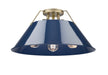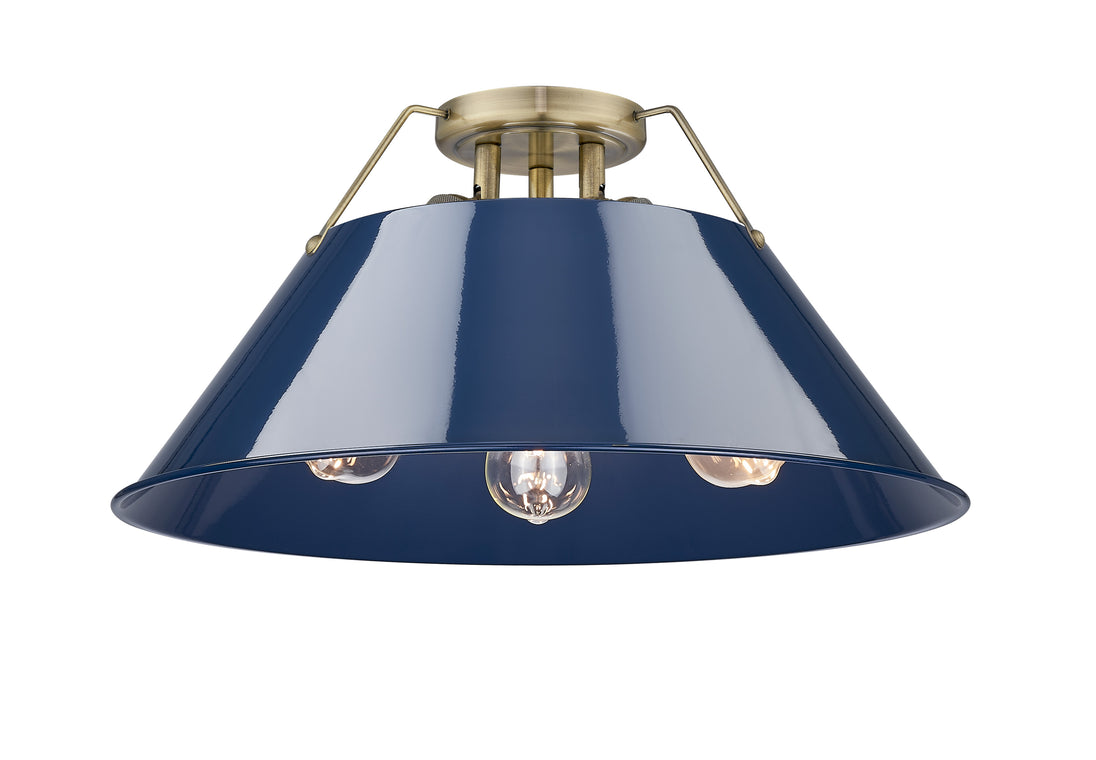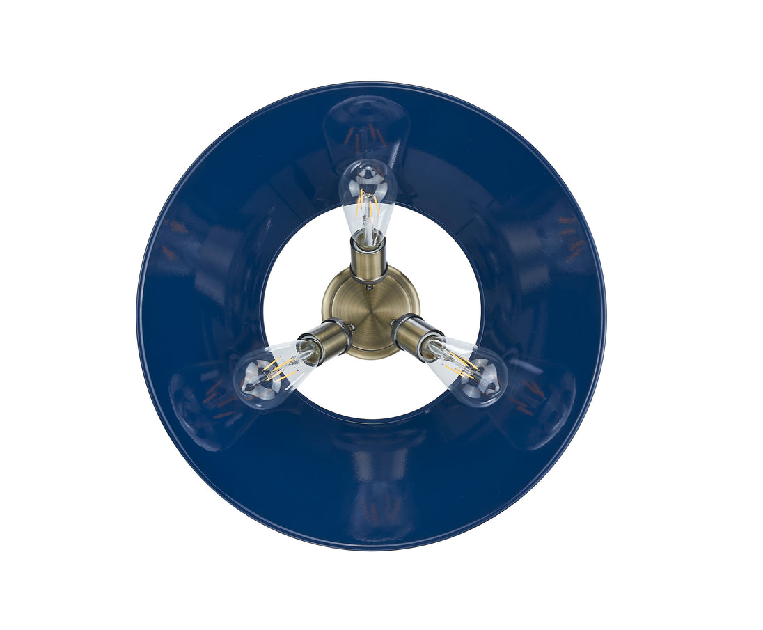 Presenting an intriguing blend of style and function, the Yep by Golden Lighting Orwell 3-light Flush Mount brings industrial elegance to your home. Featuring a striking metal shade, accented in Navy Blue, and a refined aged brass frame, it creates a dramatic yet inviting atmosphere. The metal shade showcases a vibrant Navy Blue finish, adding a sophisticated pop of color while the smooth surface glistens with a high-gloss sheen, capturing light beautifully. Crafted with an aged brass finish, this fixture exudes warmth and character, ideal for bridging traditional and contemporary aesthetics in your decor. Perfectly suited for low ceilings, this light fixture excels in hallways, closets, and bathrooms. It is damp location rated for those spaces that encounter occasional moisture. The overall dimensions are 18.75"W x 9.25"H x 18.75"D, and it requires 3 E26 Medium base bulbs (not included), with a maximum wattage of 60 per bulb. Elevate your living spaces with this stylish fixture that balances functionality and striking aesthetics, making it a standout addition to any environment.