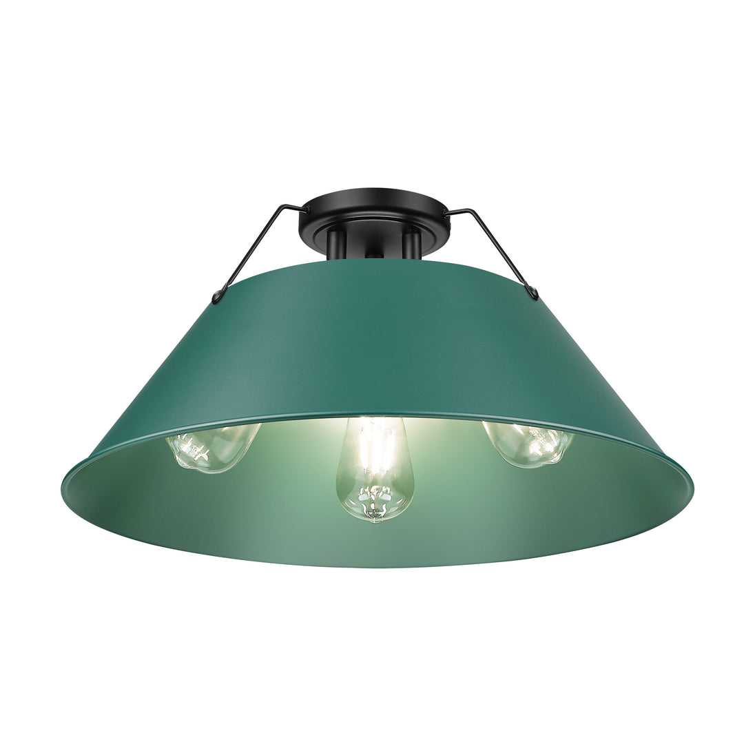 Bring industrial elegance into your home with the Yep by Golden Lighting Orwell 3-light Flush Mount. Featuring a metal shade and a matte black frame, it creates a welcoming atmosphere. The Pine Green metal shade boasts a deep, rich green color with a smooth, non-reflective finish, offering a touch of heritage style while beautifully diffusing light. Our Matte Black finish is timeless and versatile, providing an understated elegance that complements various decor styles, from modern to industrial. Ideal for low ceilings in hallways, closets, laundry areas, and bathrooms, this fixture is Damp Location Rated, making it suitable for spaces with occasional moisture. It requires 3 E26 Medium base bulbs (not included), max 60 watts per bulb. Overall dimensions are 18.75"W x 9.25"H x 18.75"D, ensuring wide illumination in compact spaces. Elevate your home’s aesthetic with this quality fixture that blends functionality and style.