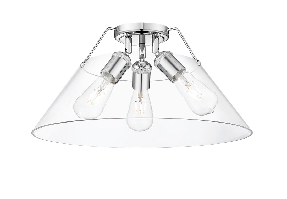 The Yep by Golden Lighting Orwell 3-light Flush Mount combines industrial design with chrome finish and a glass shade, creating brilliant illumination that elevates hallways and bathrooms.