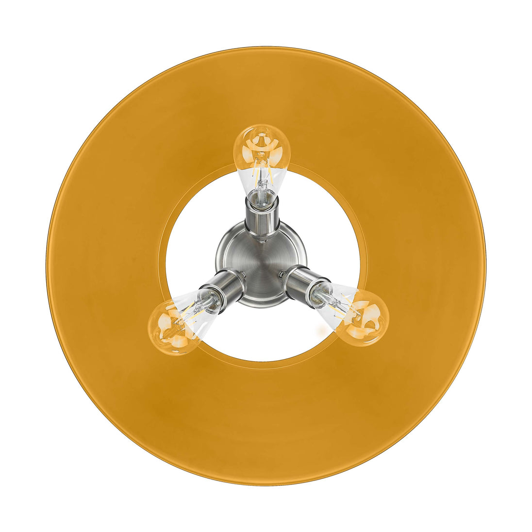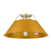 Bring industrial elegance into your home with the Yep by Golden Lighting Orwell 3-light Flush Mount. Featuring a Metal shade and a Pewter frame, it creates a welcoming atmosphere. The metal shade features an Auric Yellow finish, delivering a deep, saturated golden-yellow hue that instantly brightens spaces with a non-reflective matte sheen. Our Pewter finish offers a classic, sophisticated alternative to brighter tones, effectively complementing both traditional and contemporary interiors. Ideal for low ceilings in hallways, closets, laundry areas, and bathrooms, this fixture is damp location rated for covered and semi-enclosed spaces. Requires 3 E26 Medium base bulbs (not included), Max 60 wattage per bulb. Overall dimensions are 18.75"W x 9.25"H x 18.75"D. Elevate your space with a stunning lighting solution that unites functionality and sophisticated style.