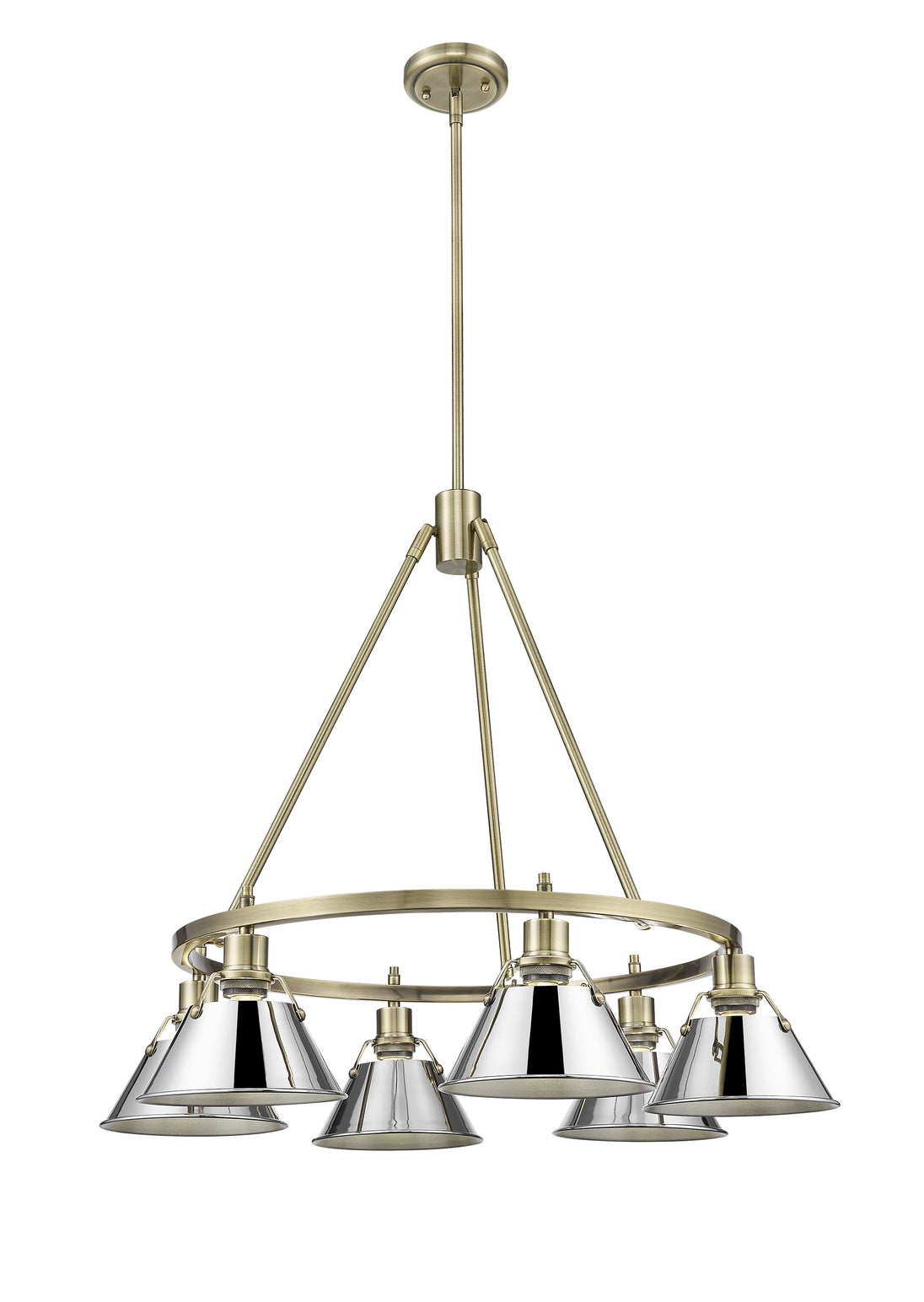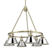 The Yep by Golden Lighting Orwell 6-light Chandelier combines industrial charm with a sophisticated Aged Brass finish and a chrome shade, creating a stunning focal point for dining areas and entryways.