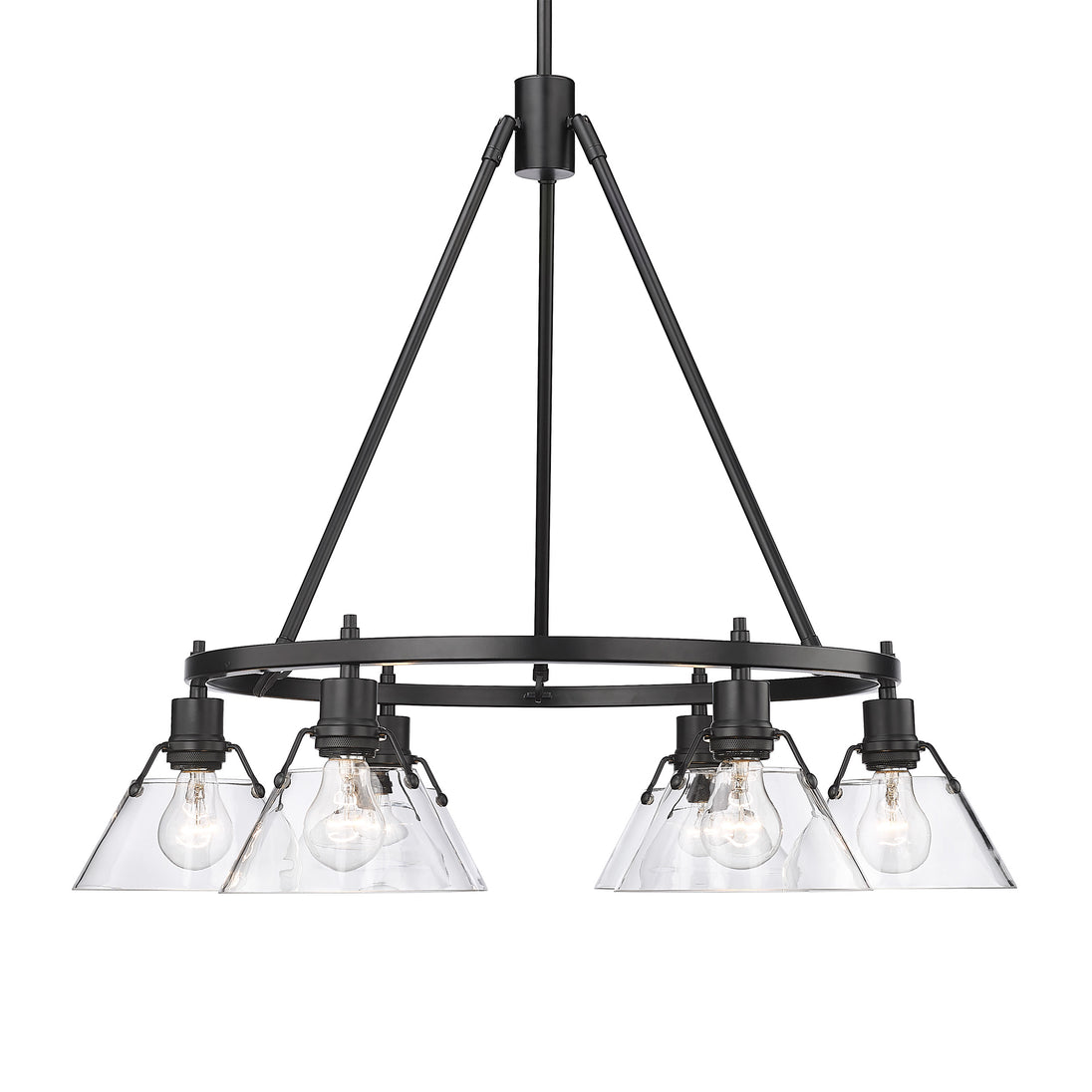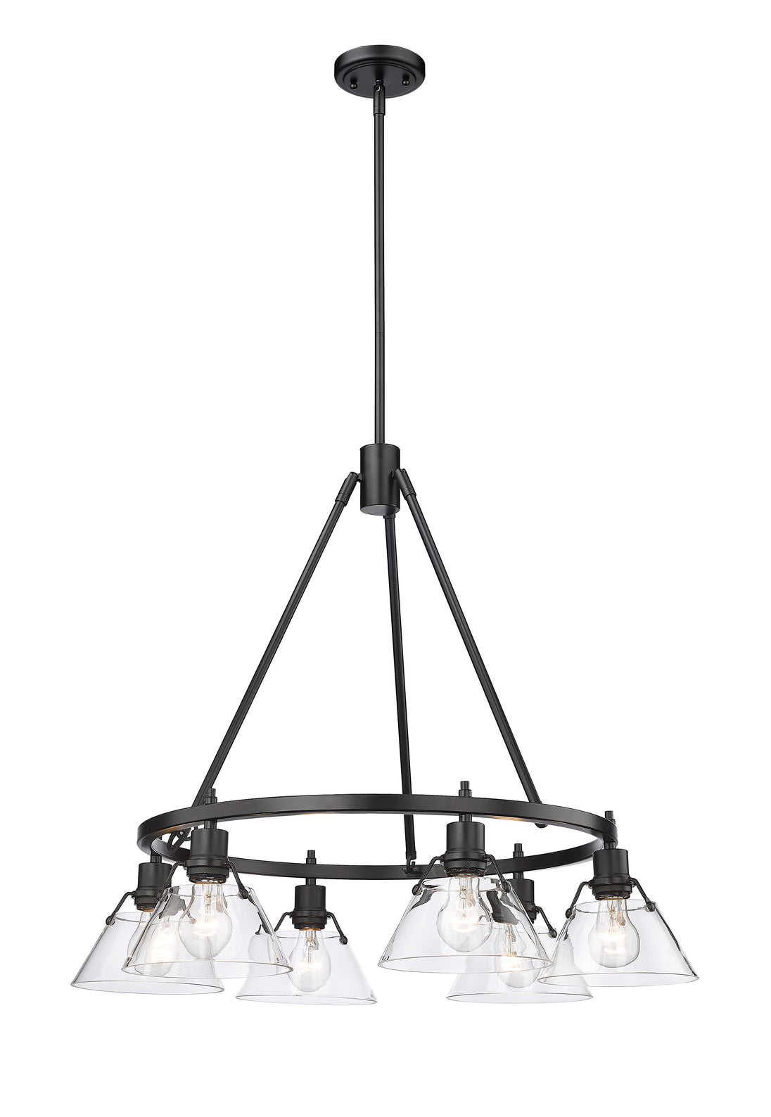 The Yep by Golden Lighting Orwell 6-light Chandelier showcases an industrial design with a matte black finish and a clear glass shade, illuminating dining rooms and living spaces with style.