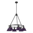 Bring industrial elegance into your home with the Yep by Golden Lighting Orwell 6-light Chandelier. Featuring a metal shade and a matte black frame, it creates a welcoming atmosphere. The metal shade draws attention with its Exotic Purple finish characterized by a deep, saturated purple color. The smooth surface with a non-reflective matte sheen enhances light absorption, adding dramatic flair to your interior. The matte black finish is the epitome of clean, modern style, offering an understated elegance that fits myriad decor styles. Its smooth texture absorbs light, providing a sophisticated look. Perfect for dining rooms and foyers, this chandelier is dry location rated, making it ideal for indoor spaces. Installation is easy with its sloped-ceiling compatibility and adjustable height options (Min: 21.25" - Max: 63.25"). Overall dimensions: 29"W x 20.38"H x 29"D. It requires 6 E26 Medium base bulbs (not included), with a maximum of 60 watts per bulb. Elevate your space with style and quality that inspires admiration.
