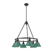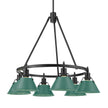 Bring industrial elegance into your home with the Yep by Golden Lighting Orwell 6-light Chandelier. Featuring a metal shade and a matte black frame, it creates a welcoming atmosphere. The metal shade captures attention with its Pine Green finish, a rich, saturated green that offers a calming ambiance. Its smooth, non-reflective surface beautifully absorbs light, adding a touch of sophistication to your decor. The matte black finish embodies timeless modern style, enhancing a wide range of interiors with its understated elegance. Smooth to the touch, it absorbs light to create a serene, aesthetically pleasing look. Ideal for dining rooms and foyers, this chandelier is dry location rated for safe indoor use. Installation is straightforward with sloped-ceiling compatibility and adjustable height (Min: 21.25" - Max: 63.25"). Overall dimensions: 29"W x 20.38"H x 29"D. It requires 6 E26 Medium base bulbs (not included), up to 60 watts each. Infuse your home with character and quality lighting that transforms your space.
