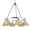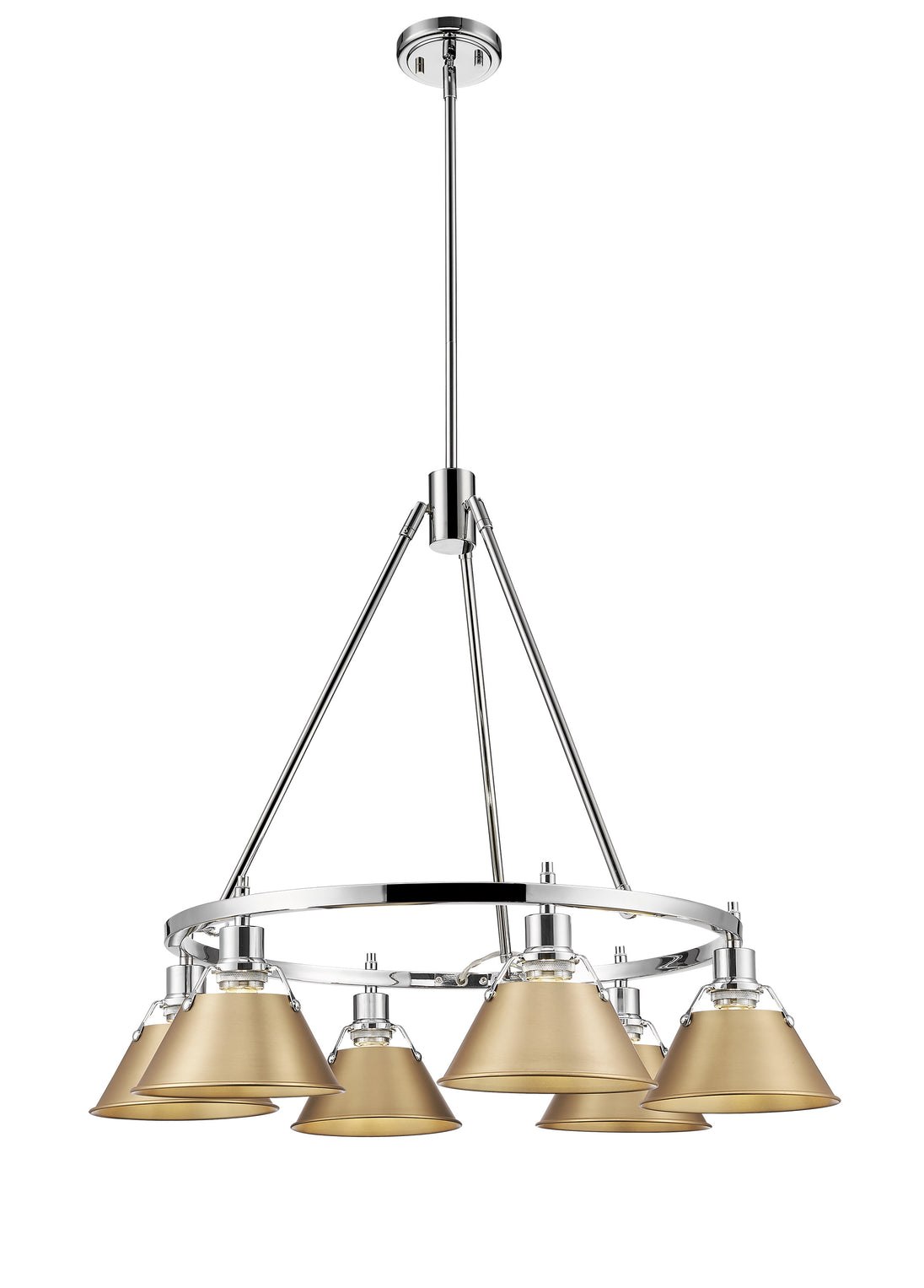 Bring contemporary industrial elegance into your home with the Yep by Golden Lighting Orwell 6-light Chandelier. Featuring a metal shade and a chrome frame, this chandelier creates a warm and inviting atmosphere. The metal shade, designed in Brushed Champagne Brass, showcases a soft satin sheen with a refined brushed texture that beautifully interacts with light. The versatile chrome finish enhances the overall aesthetic appeal, making it suitable for a variety of decor styles. This chandelier is perfect for dry locations and ideal for indoor spaces such as bedrooms, living rooms, and hallways. Easy to install, it features sloped-ceiling compatibility and an adjustable height (Min: 21.25"- Max: 63.25"). With dimensions of 29"W x 20.38"H x 29"D, it requires 6 E26 Medium base bulbs (not included). Enhance your home ambiance with this striking chandelier that exudes luxury and style.