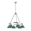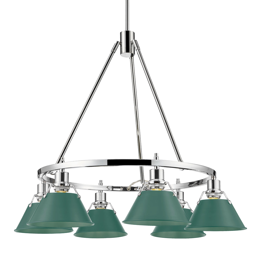 Transform your space with a touch of industrial sophistication. The Yep by Golden Lighting Orwell 6-light Chandelier features a sleek metal shade and a polished chrome frame, creating a welcoming atmosphere in any room. This metal shade, finished in Pine Green, offers a calming hue that absorbs light beautifully, adding style and sophistication to your decor. The low-lustre surface brings an understated elegance to your space. Brilliant and timeless, our polished chrome finish offers a crisp, clean aesthetic that elevates any space. Its reflective surface integrates seamlessly into a variety of styles, from ultra-modern to traditional. Perfect for indoor spaces not subject to moisture, this chandelier is designed for versatility with sloped-ceiling compatibility and adjustable height from 21.25" to 63.25". With overall dimensions of 29"W x 20.38"H x 29"D, it requires 6 E26 medium base bulbs (not included), with a maximum wattage of 60 per bulb. Elevate your interior with the quality craftsmanship of Yep by Golden Lighting, creating a modern yet timeless allure.