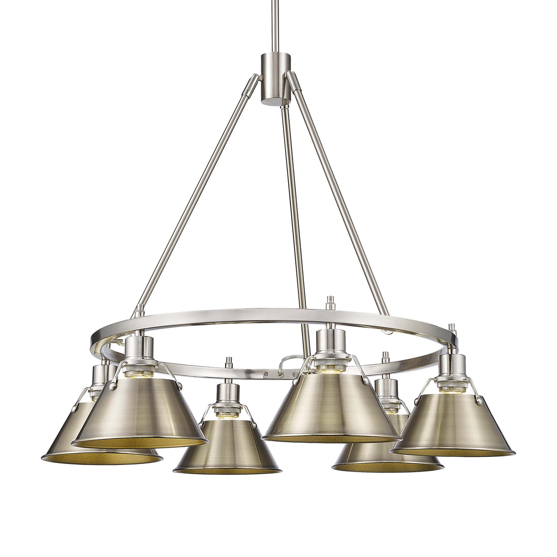 Bring industrial elegance into your home with the Yep by Golden Lighting Orwell 6-light Chandelier. Featuring a metal shade and a pewter frame, it creates a welcoming atmosphere. This chandelier showcases an Aged Brass electroplated finish that features a warm, antiqued gold base with darker undertones. This surface has a low-luster satin sheen that adds visual depth while beautifully catching and diffusing light, reminiscent of classic hardware. With its exquisite Pewter finish, this chandelier offers a soft and classic alternative to brighter silver tones, providing both sophistication and charm. Ideal for dining rooms and foyers, it’s also perfect for bedrooms and living spaces that crave a touch of vintage elegance. Rated for dry locations, installation is a breeze with its adjustable height feature that accommodates sloped ceilings and a minimum height of 21.25" up to a maximum of 63.25". The overall dimensions are 29"W x 20.38"H x 29"D and it requires 6 E26 Medium base bulbs (not included) with a maximum wattage of 60 per bulb. Enhance your space with this stunning fixture that brings a blend of tradition and modernity, perfect for any setting.