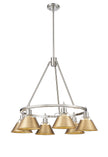Bring industrial elegance into your home with the Yep by Golden Lighting Orwell 6-light Chandelier. Featuring a metal shade and a Pewter frame, it creates a welcoming atmosphere. The stylish metal shade in Brushed Champagne Brass presents a soft, satin lustre that beautifully catches the light, providing a modern and luxurious touch to your decor. Our Pewter finish offers a classic appeal, carefully crafted for durability and designed to diffuse light evenly without glare. Ideal for dining rooms, hallways, and living areas, this Dry Location Rated fixture is perfect for spaces not exposed to moisture. It is sloped-ceiling compatible and provides adjustable height from 21.25" to 63.25". Overall Dimensions: 29"W x 20.38"H x 29"D. Requires 6 E26 Medium base bulbs (not included), max 60 watts per bulb. Fuse quality with sophistication in your home with this eye-catching chandelier, a perfect blend of vintage charm and modern elegance.