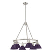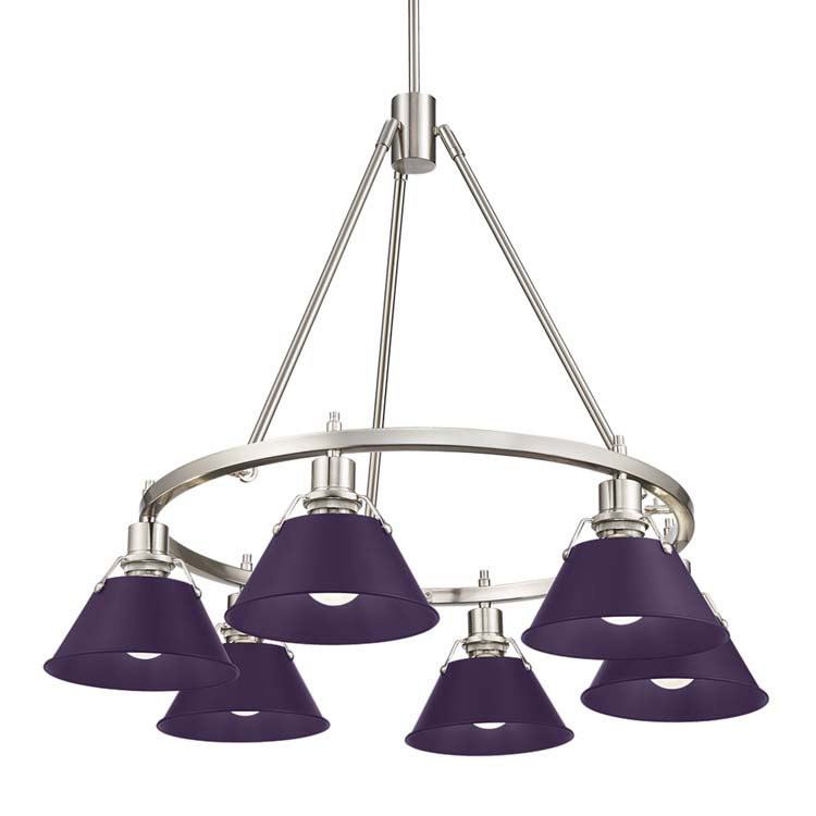 Bring industrial elegance into your home with the Yep by Golden Lighting Orwell 6-light Chandelier. Featuring a metal shade and a pewter frame, it creates a welcoming atmosphere. The metal shade showcases an Exotic Purple finish, featuring a deep, saturated hue with a non-reflective, flat matte sheen for a luxurious look. This stunning combination absorbs light beautifully, enhancing the color's richness. Our pewter finish offers a soft and classic alternative to brighter silver tones. With its medium-grey hue and subtle warmth, this finish brings an understated charm to both classic and contemporary interiors. Ideal for indoor spaces not subject to moisture, such as bedrooms, living rooms, and hallways, this chandelier is also sloped-ceiling compatible with an adjustable height ranging from 21.25" to 63.25". Overall dimensions are 29"W x 20.38"H x 29"D, requiring 6 E26 Medium base bulbs (not included) with a maximum wattage of 60 per bulb. Enhance your space with this timeless piece that delivers both style and quality.