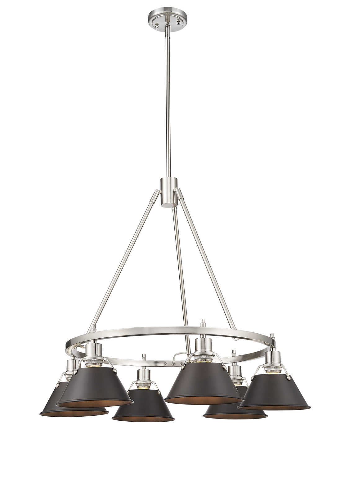 Bring industrial elegance into your home with the Yep by Golden Lighting Orwell 6-light Chandelier. Featuring a rubbed bronze shade and a pewter frame, it creates a welcoming atmosphere. The rubbed bronze shade allows for enhanced light diffusion, giving your space a warm and inviting glow. The pewter finish offers an understated warmth and timeless appeal, crafted through an electroplating process that results in a stunning satin lustre that complements any decor. Perfect for dining rooms and foyers, this chandelier is dry location rated for indoor settings and is compatible with sloped ceilings for versatile installation. It has an adjustable height that ranges from 21.25" to 63.25". With dimensions of 29"W x 20.38"H x 29"D, it requires six E26 medium base bulbs (not included), with a maximum wattage of 60 each. Enhance your interior with a blend of sophistication and quality craftsmanship that defines Yep by Golden Lighting.