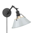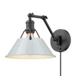 Bring industrial elegance into your home with the Yep by Golden Lighting Orwell 1-light Swing Arm Wall Lamp. Featuring a metal shade in dusky blue and a matte black frame, it creates a welcoming atmosphere. The dusky blue shade offers a serene and sophisticated touch of color, reminiscent of vintage enamelware, while enhancing the brightness in the room. The matte black finish epitomizes clean, modern style, ensuring a timeless and versatile look for any decor. With adjustable convenience for bedrooms and home offices, this lamp is an ideal choice for reading or task lighting. It is damp location rated, suitable for covered and semi-enclosed spaces with occasional moisture. The flexible task lighting allows for positioning the light exactly where needed, while the adjustable height provides customization in your space. Overall Dimensions: 10"W x 9"H x 11.5"D. Requires 1 E26 Medium base bulb (not included) with a maximum wattage of 100, ensuring ample illumination for various tasks. Elevate your space with this stylish fixture that fuses quality craftsmanship with aesthetic appeal.