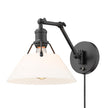 The Yep by Golden Lighting Orwell 1-light Swing Arm Wall Lamp combines industrial design with a matte black finish and an opal glass shade, creating a soft lighting effect that elevates bedrooms and home offices.