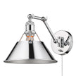 Bring industrial elegance into your home with the Yep by Golden Lighting Orwell 1-light Swing Arm Wall Lamp. Featuring a metal shade and a chrome frame, it creates a welcoming atmosphere. This polished chrome shade offers a bright, cool-toned silver color that provides a stunning, high-shine effect, integrating beautifully into any decor. The classic chrome finish elevates the design with a sleek and sophisticated appearance. Ideal for bedrooms and home offices, this lamp is damp location rated for covered spaces, and its adjustable swing arm allows for perfect positioning. Dimensions: 10"W x 9"H x 11.5"D, requires 1 E26 Medium base bulb (not included) with a maximum wattage of 100. Enjoy timeless style and exceptional function that brightens your space.