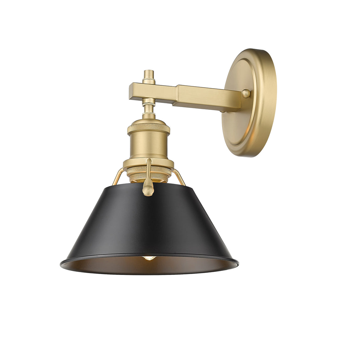 Bring industrial elegance into your home with the Yep by Golden Lighting Orwell 1-light Vanity. Featuring a Metal shade and a Brushed Champagne Brass frame, it creates a welcoming atmosphere. This Metal shade showcases a classic Matte Black finish, delivering a non-reflective matte sheen that absorbs light for a soft, sophisticated look. The shade's deep, uniform black color provides a sleek touch that complements modern decor. The Brushed Champagne Brass finish offers a chic alternative to traditional gold, combining the warmth of brass with the cool softness of silver, encouraging quiet luxury and contemporary style. Perfect for brightening up bathrooms, this fixture is Damp Location Rated and suitable for covered and semi-enclosed spaces with occasional moisture. Enjoy easy installation and practical task illumination with its overall dimensions of 7.5"W x 9.88"H x 8.5"D. It requires 1 E26 Medium base bulb (not included), supporting a maximum wattage of 100. Elevate your space with the quality and style that the Yep by Golden Lighting provides.