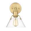 The Yep by Golden Lighting Orwell 1-light Vanity combines industrial design with Brushed Champagne Brass and a Clear Glass shade, creating brilliant illumination that enhances bathrooms.