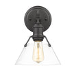 Bring industrial elegance into your home with the Yep by Golden Lighting Orwell 1-light Vanity in Matte Black and Clear Glass. Featuring a clear glass shade and a matte black frame, it creates a welcoming atmosphere. The clear glass shade provides unobstructed light, showcasing the brilliance of the bulb while maintaining a polished appearance. Its smooth, transparent surface allows for easy illumination of your space, making it a versatile choice for any decor. This vanity light is designed for bathrooms and other damp environments, rated for wet and semi-enclosed areas, ensuring both style and resilience in moisture-prone settings. Requires installation with an E26 Medium base bulb (not included), with a maximum wattage of 100. Dimensions are an overall size of 7.5"W x 9.88"H x 8.5"D. Elevate your area effortlessly with this quality fixture that beautifully combines functionality and modern style, perfect for creating a warm ambiance.
