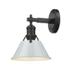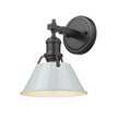 Bring industrial elegance into your home with the Yep by Golden Lighting Orwell 1-light Vanity. Featuring a metal shade and a Matte Black frame, it creates a welcoming atmosphere. The Dusky Blue metal shade offers a serene and sophisticated touch, reminiscent of vintage enamelware, with a smooth surface and high-gloss sheen that enhances its clean lines. The epitome of clean, modern style, the Matte Black finish is smooth to the touch, offering understated elegance that complements any decor from minimalist to bold. Brighten up bathrooms with dedicated lighting that flatters and provides practical task illumination, suitable for damp locations like covered porches and laundry rooms. Requires 1 E26 Medium base bulb (not included), with a maximum wattage of 100. Overall dimensions are 7.5"W x 9.88"H x 8.5"D. This fixture combines functionality with a vintage industrial edge, offering quality and style for your space.