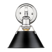 Bring industrial elegance into your home with the Yep by Golden Lighting Orwell 1-light Vanity. Featuring a metal shade and a chrome frame, it creates a welcoming atmosphere. The metal shade contributes to a soft, sophisticated look, complemented by its deep, uniform black color and non-reflective matte sheen, offering a strong graphic quality that enhances any decor style. Brilliant and timeless, our Polished Chrome finish provides a stunning, high-shine gleam that seamlessly integrates into various decor styles—from ultra-modern to classic traditional. Its easy-to-clean surface adds a touch of brightness and polished perfection to your home. Brighten up bathrooms with dedicated lighting that flatters while providing practical task illumination. This fixture is Damp Location Rated, making it suitable for covered or semi-enclosed spaces like bathrooms and laundry rooms. Overall dimensions are 7.5"W x 9.88"H x 8.5"D. Requires 1 E26 Medium base bulb (not included), with a maximum wattage of 100. Experience quality craftsmanship and a design that delights while fulfilling your lighting needs.