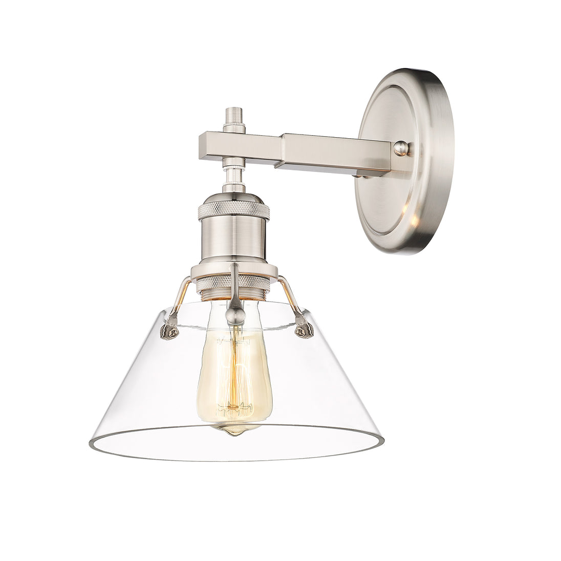 Bring a touch of industrial elegance into your home with the Yep by Golden Lighting Orwell 1-light Vanity. Featuring a clear glass shade and a pewter frame, it creates a welcoming atmosphere. The clear glass shade offers unobstructed light, allowing the brilliance of the bulb to shine through while providing a clean and timeless appeal. This design complements a wide array of styles from modern to classic. The vanity fixture is coated in a pewter finish, achieved through a durable electroplating process which provides a satin lustre and an elegant glow, making it perfect for both vintage and contemporary settings. Great for adding dedicated lighting in bathrooms, this fixture is rated for damp locations, making it suitable for areas with occasional moisture. Requires 1 E26 Medium base bulb (not included) with a maximum wattage of 100. Overall dimensions are 7.5"W x 9.88"H x 8.5"D, ideal for versatile placements. Embrace the beauty of bright light combined with quality craftsmanship.