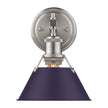 Bring industrial elegance into your home with the Yep by Golden Lighting Orwell 1-light Vanity. Featuring a metal shade and a pewter frame, it creates a welcoming atmosphere. The rich Exotic Purple metal shade offers a bold and luxurious statement with its smooth, non-reflective surface that absorbs light beautifully. Our pewter finish provides an understated, classic appeal, achieved through a durable electroplating process and fine directional brushing that diffuses light creating an elegant, non-glare glow. This vanity light is ideal for bathrooms, offering damp location rating for occasional moisture areas and practical task illumination. Requires 1 E26 medium base bulbs (not included), max 100 wattage per bulb. Dimensions: 7.5"W x 9.88"H x 8.5"D. Elevate your space with this sophisticated fixture, perfect for both classic and modern interiors.