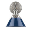 Bring industrial elegance into your home with the Yep by Golden Lighting Orwell 1-light Vanity. Featuring a metal shade and a pewter frame, it creates a welcoming atmosphere. The Navy Blue metal shade offers a striking deep blue finish that reflects surroundings with a high-gloss sheen, providing a stunning visual impact. Our pewter finish provides an understated, classic appeal, achieved through a durable electroplating process and fine directional brushing that diffuses light creating an elegant, non-glare glow. This vanity light is ideal for bathrooms, offering damp location rating for occasional moisture areas and practical task illumination. Requires 1 E26 medium base bulbs (not included), max 100 wattage per bulb. Dimensions: 7.5"W x 9.88"H x 8.5"D. Elevate your space with this sophisticated fixture, perfect for both classic and modern interiors.