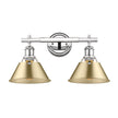 Bring industrial elegance into your home with the Yep by Golden Lighting Orwell 2-light Vanity. Featuring a metal shade and a polished chrome frame, it creates a welcoming atmosphere. The metal shade in Brushed Champagne Brass offers a soft satin luster and a refined texture that beautifully catches the light. Brilliant and timeless, the Polished Chrome finish provides a crisp, clean look that is incredibly versatile and easy to clean. This vanity light is rated for damp locations, making it suitable for bathrooms, covered porches, and laundry rooms. Requires 2 E26 Medium base bulbs (not included) with a maximum wattage of 100 per bulb, and overall dimensions are 18.25"W x 9.88"H x 8.5"D. Elevate your space with quality and style.