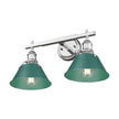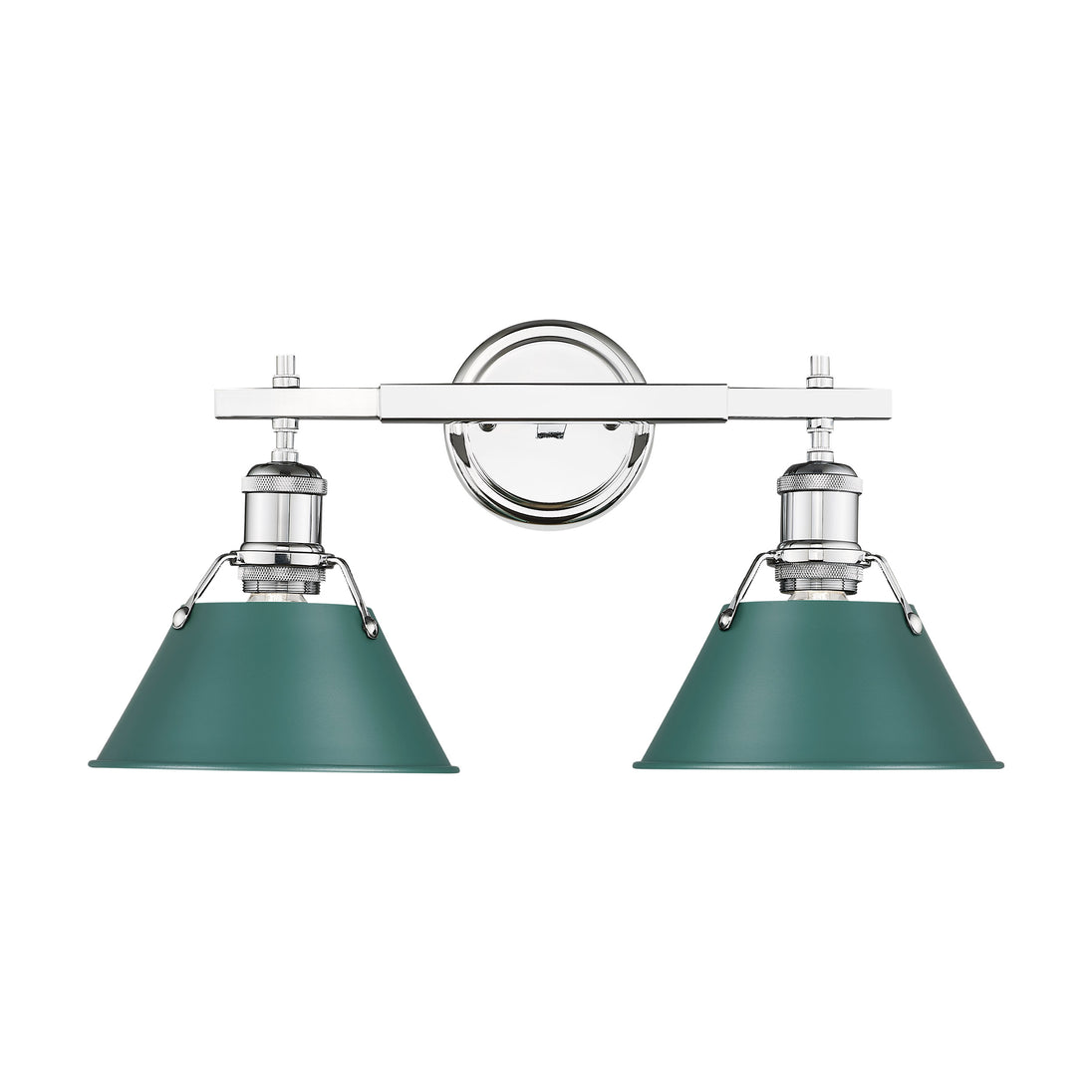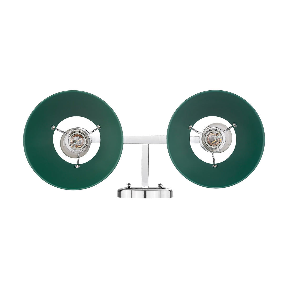 Bring industrial elegance into your home with the Yep by Golden Lighting Orwell 2-light Vanity. Featuring a metal shade and a chrome frame, it creates a welcoming atmosphere. The metal shade, finished in a rich Pine Green, beautifully absorbs light, offering understated elegance. The smooth, non-reflective surface provides a calming glow perfect for bathroom settings. The brilliant Polished Chrome finish offers a crisp, clean look that seamlessly integrates into a variety of decor styles from modern to classic. It’s created through a durable electroplating process that not only adds brightness but also ensures easy cleaning. This fixture is damp location rated, making it ideal for bathrooms, covered porches, or laundry rooms. Requires no additional installation adjustments and fits into standard fixtures with ease. The unit requires 2 E26 Medium base bulbs (not included), with a maximum wattage of 100 per bulb. With overall dimensions of 18.25"W x 9.88"H x 8.5"D, it is optimized for both illumination and aesthetic appeal, providing practical task lighting with style. Transform your space with this quality fixture that merges functionality and vintage charm.