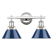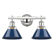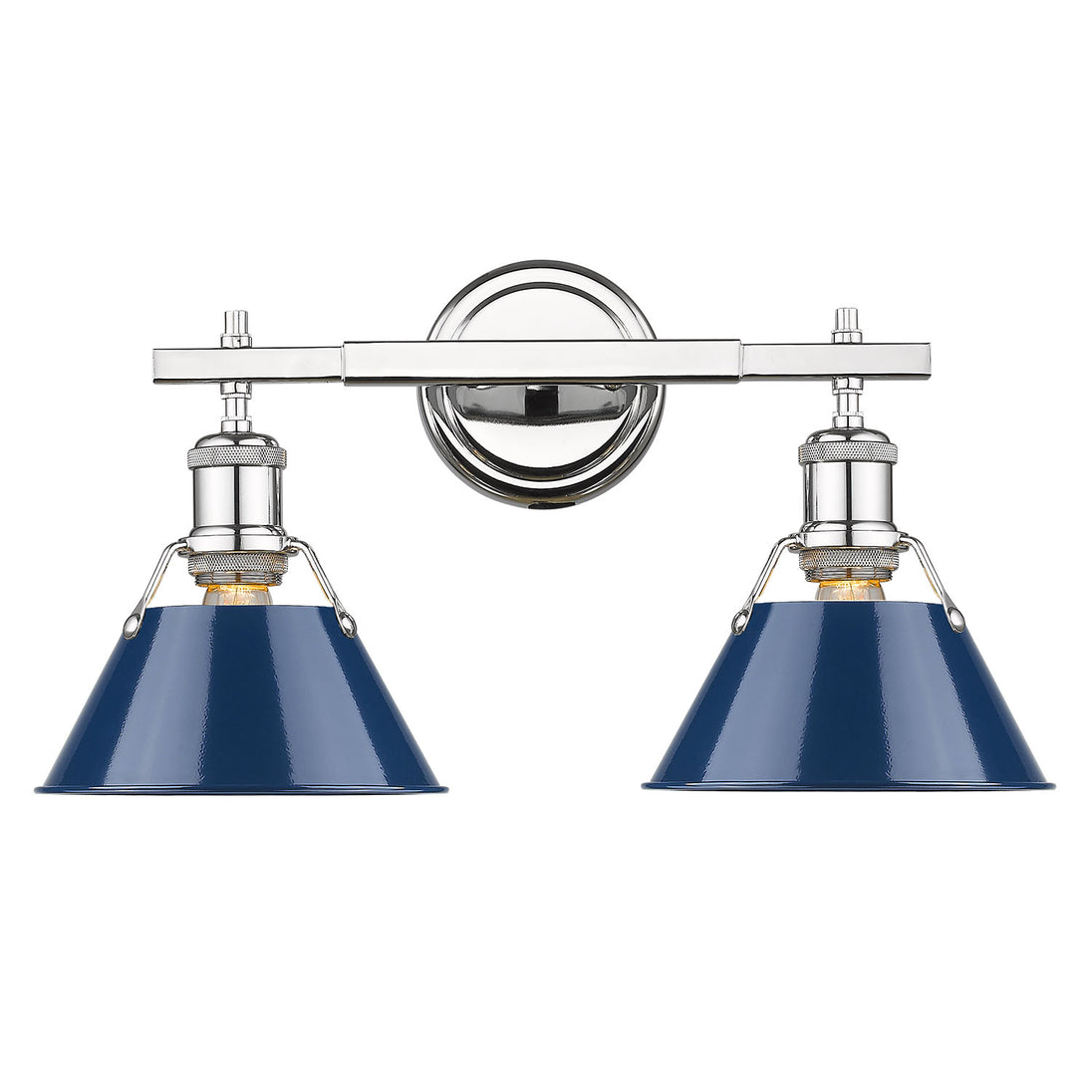 Bring industrial elegance into your home with the Yep by Golden Lighting Orwell 2-light Vanity. Featuring a Metal shade and a Chrome frame, it creates a welcoming atmosphere. The Navy blue color of the metal shade adds a bold and sophisticated pop, reflecting timeless nautical style with its smooth, high-gloss surface. The Polished Chrome finish offers a brilliant, mirror-like sheen that complements a variety of decor styles, providing a clean and polished look. Perfect for bathrooms, this fixture is Damp Location Rated, making it suitable for covered and semi-enclosed spaces with humidity, like bathrooms and laundry rooms. Requires 2 E26 Medium base bulbs (not included), max 100 wattage per bulb. Overall dimensions are 18.25"W x 9.88"H x 8.5"D. Elevate your bathroom with stylish lighting that perfectly balances aesthetics and functionality.
