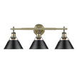 The Yep by Golden Lighting Orwell 3-light Vanity combines industrial design with aged brass and a metal shade, creating a warm glow that elevates bathrooms.