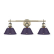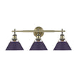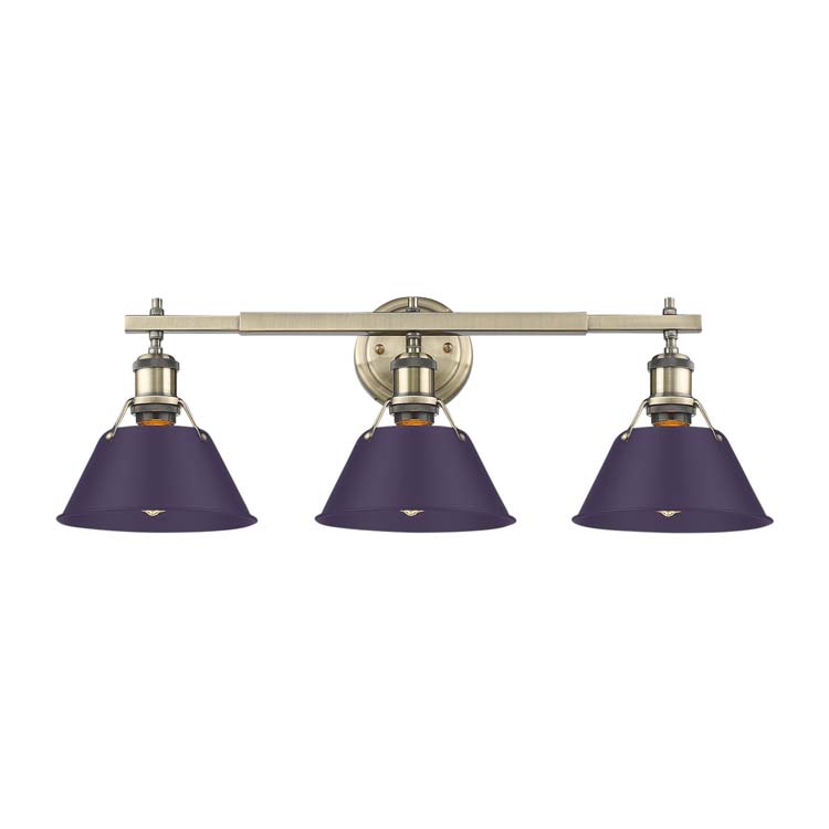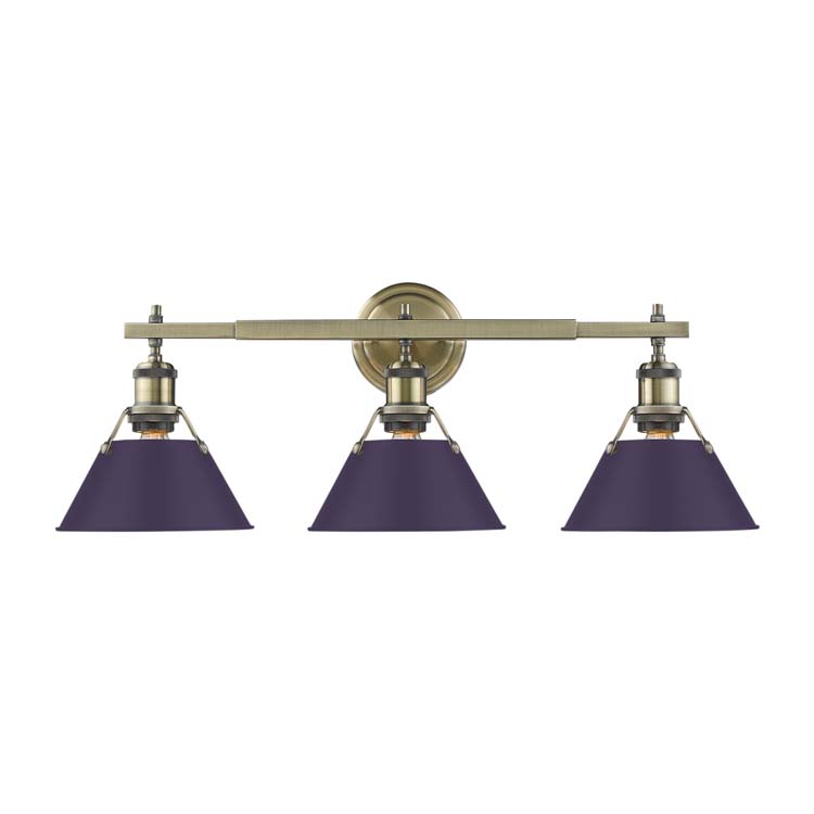 Inject a burst of luxury into your home with the Yep by Golden Lighting Orwell 3-light Vanity. Featuring a striking metal shade and an Aged Brass frame, it creates a compelling ambiance. The Exotic Purple metal shade offers a bold statement while ensuring optimal task lighting for everyday use. The Aged Brass finish adds a welcoming shine, making it perfect for varying decor styles from traditional to contemporary. This fixture is Damp Location Rated, making it suitable for bathrooms and laundry spaces. The open-top shade design amplifies the ambient light experience. It requires three E26 Medium base bulbs (not included), with a maximum wattage of 100 each. The overall dimensions measure 27.25"W x 9.88"H x 8.5"D, allowing for an impactful presence in any setting. Elevate your bathroom's aesthetic with this blend of quality, style, and functionality.