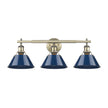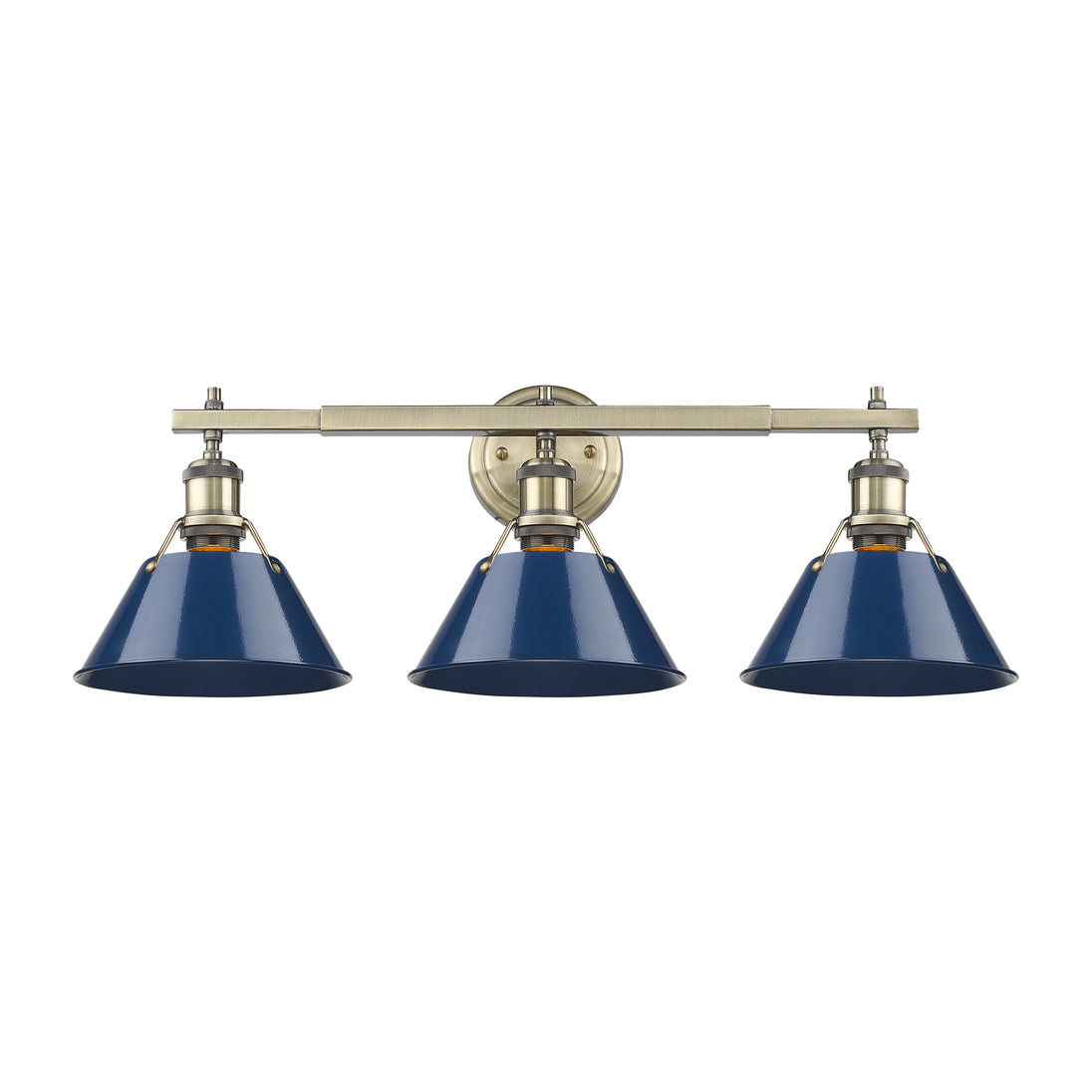 Bring industrial elegance into your home with the Yep by Golden Lighting Orwell 3-light Vanity in Aged Brass and Navy Blue shade. Featuring a metal shade and a sophisticated aged brass frame, it creates a welcoming atmosphere in any space. The navy blue metal shade exhibits a smooth and high-gloss finish, offering a bold pop of color while reflecting light beautifully. This classic navy finish enhances the striking look, reminiscent of timeless nautical style. Embrace timeless elegance with our Aged Brass finish, creating a warm, inviting glow. This gorgeous finish, achieved through a durable electroplating process, adds depth and character. Perfect for brightening bathrooms or other covered spaces, it's rated for damp locations and fits seamlessly into areas with occasional moisture. Requires 3 E26 Medium base bulbs (not included), with dimensions of 27.25"W x 9.88"H x 8.5"D. Elevate your decor with a stylish and functional light fixture that boasts quality and sophistication.