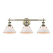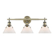The Yep by Golden Lighting Orwell 3-light Vanity combines industrial design with Aged Brass and Opal Glass, creating a luminous glow that elevates bathrooms.