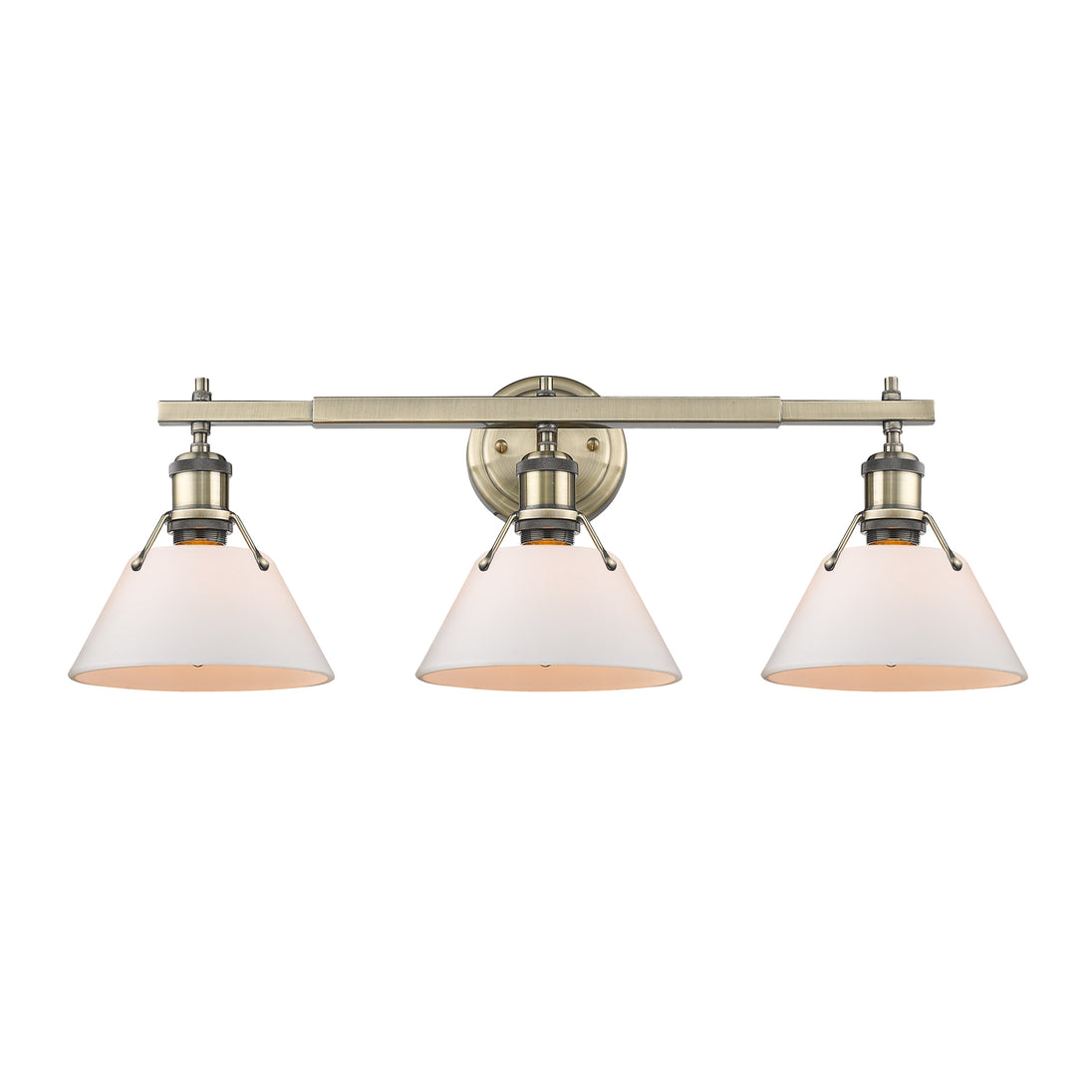 Bring industrial elegance into your home with the Yep by Golden Lighting Orwell 3-light Vanity in Aged Brass and Opal Glass. Featuring an opal glass shade and a sophisticated aged brass frame, it creates a welcoming atmosphere in any space. The opal glass shade is designed to diffuse light evenly, offering a soft, glare-free glow that enhances the ambiance. Its classic, milky white surface is both timeless and elegant, perfect for any decor style. Embrace timeless elegance with our Aged Brass finish that creates a warm and inviting glow, adding depth and character to traditional, transitional, or industrial-inspired spaces. Ideal for brightening bathrooms or other covered spaces, it's rated for damp locations and fits seamlessly into areas with occasional moisture. Requires 3 E26 Medium base bulbs (not included), with dimensions of 27.25"W x 9.88"H x 8.5"D. Elevate your decor with a stylish, functional light fixture that combines quality with aesthetic appeal.