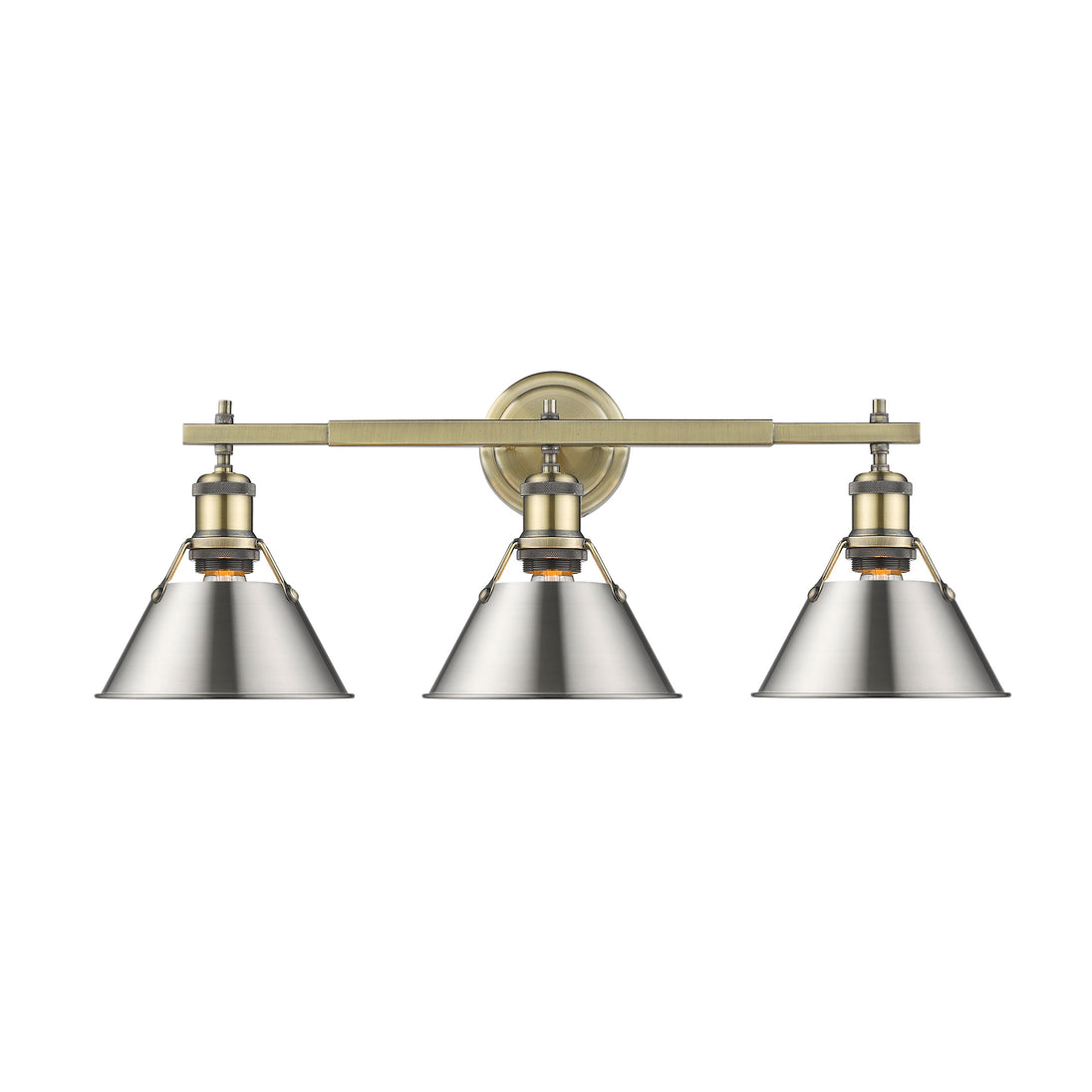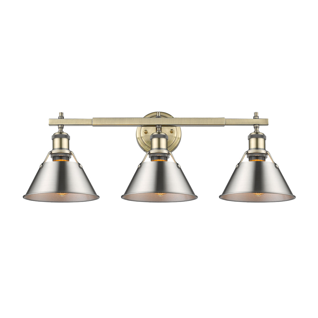 Bring industrial elegance into your home with the Yep by Golden Lighting Orwell 3-light Vanity in Aged Brass and Pewter shade. Featuring a metal shade and a sophisticated aged brass frame, it creates a welcoming atmosphere in any space. The pewter metal shade offers a soft, satin lustre with a medium-toned, warm silver-grey finish, providing a classic touch while effectively diffusing light for a graceful ambiance. Embrace timeless elegance with our Aged Brass finish, creating a warm and inviting glow. This gorgeous finish, achieved through a durable electroplating process, adds depth and character. Perfect for brightening bathrooms or other covered spaces, it’s rated for damp locations and fits seamlessly into areas with occasional moisture. Requires 3 E26 Medium base bulbs (not included), with dimensions of 27.25"W x 9.88"H x 8.5"D. Elevate your decor with a stylish and functional light fixture that boasts quality and sophistication.