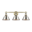 The Yep by Golden Lighting Orwell 3-light Vanity combines industrial design with Aged Brass and a Pewter shade, creating a warm glow that elevates bathrooms.