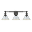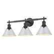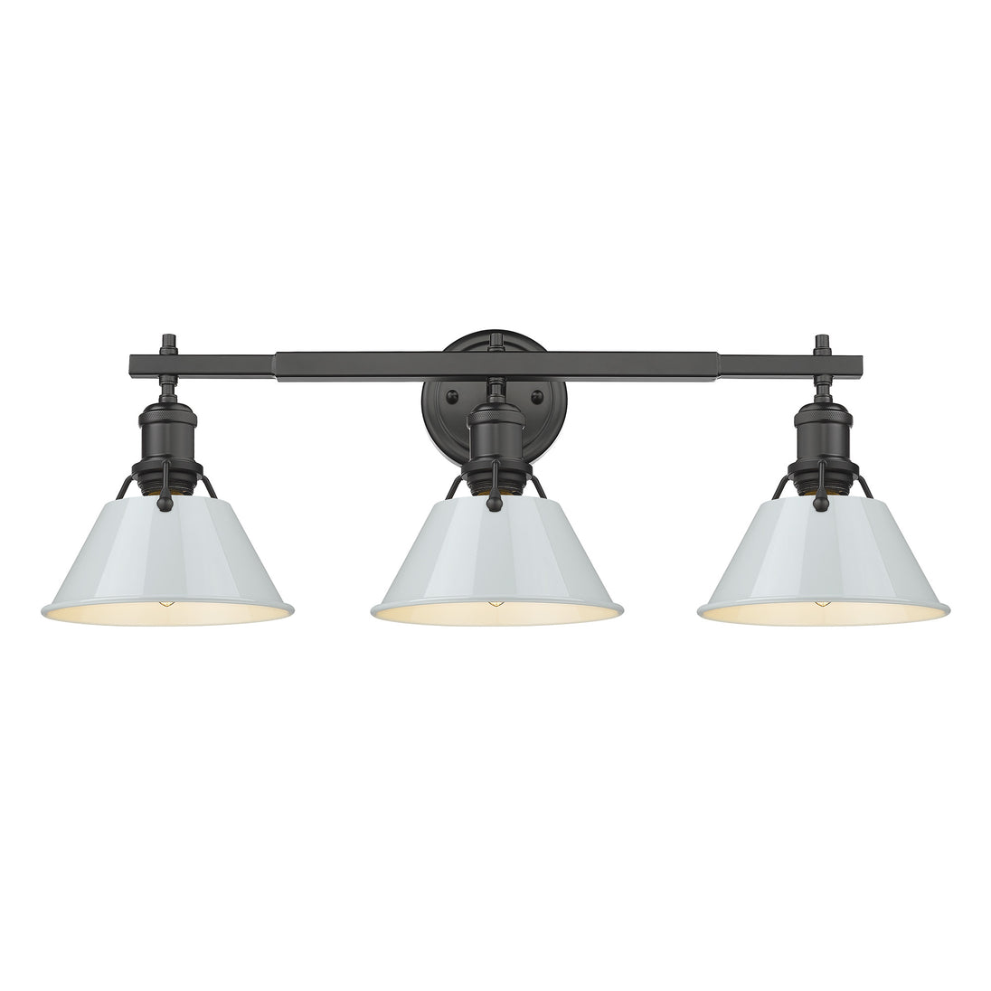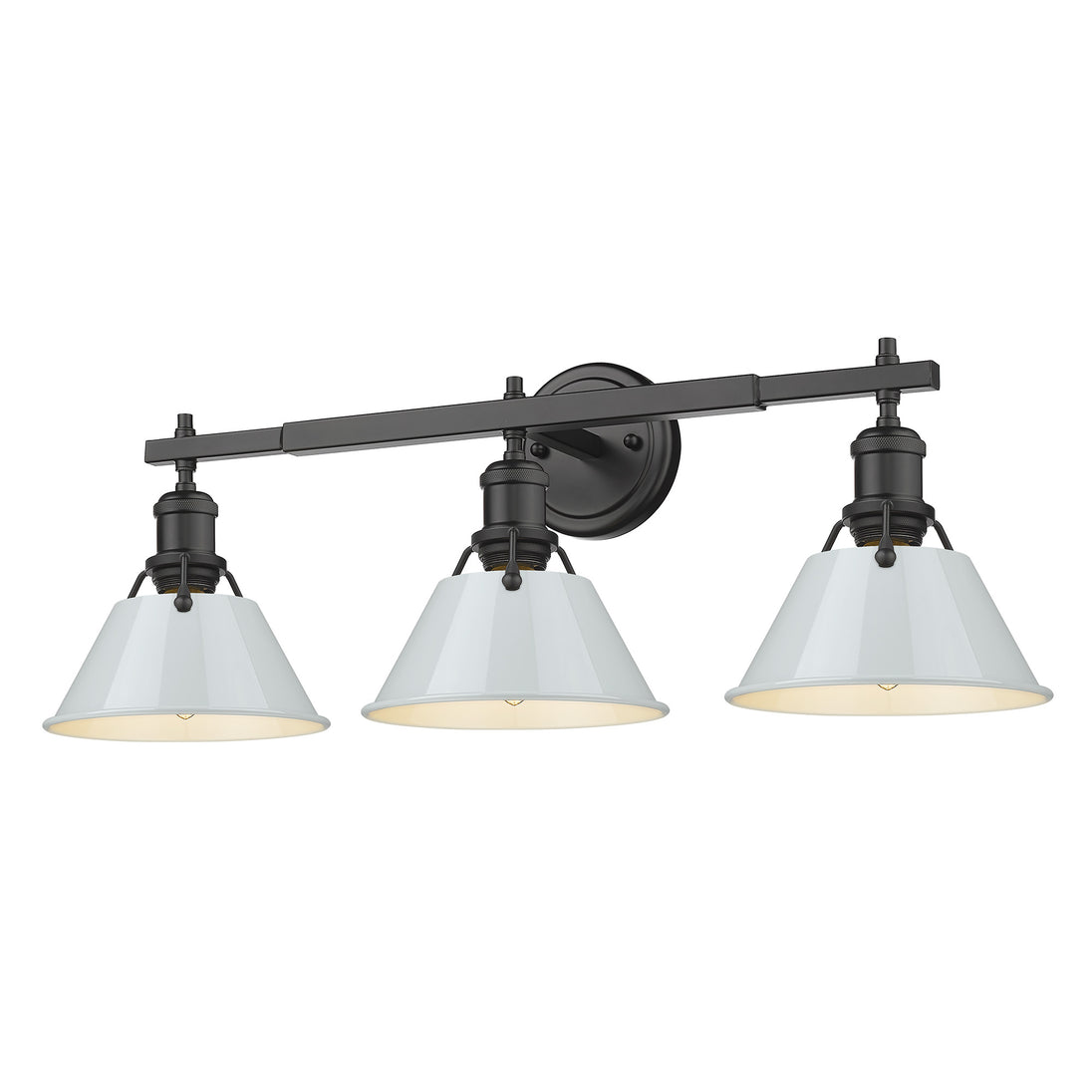 Bring industrial elegance into your home with the Yep by Golden Lighting Orwell 3-light Vanity. Featuring a Metal shade and a Matte Black frame, it creates a welcoming atmosphere. The Metal shade adds a serene touch with its Dusky Blue finish, reminiscent of vintage enamelware. This high-gloss, smooth surface enhances your lighting and complements the clean lines of the fixture. The Matte Black finish epitomizes timeless style, offering a smooth, non-reflective surface that absorbs light for a sophisticated effect. It seamlessly fits into various decor styles, from minimalist to bold modern interiors. Brighten up bathrooms with dedicated lighting that flatters while providing practical task illumination. This fixture is Damp Location Rated, suitable for covered and semi-enclosed spaces with occasional moisture, like bathrooms and laundry rooms. It requires 3 E26 Medium base bulbs (not included), with a maximum wattage of 100 per bulb. The overall dimensions are 27.25"W x 9.88"H x 8.5"D. Attractive and modern, the Orwell Vanity Light will enhance your bathroom with its strong presence and quality craftsmanship.