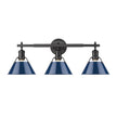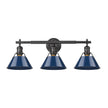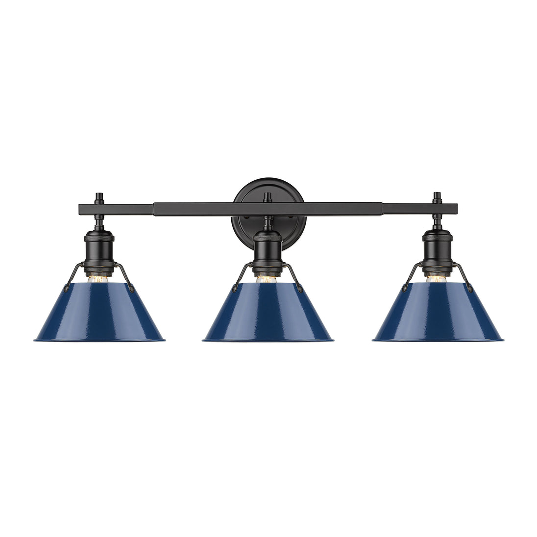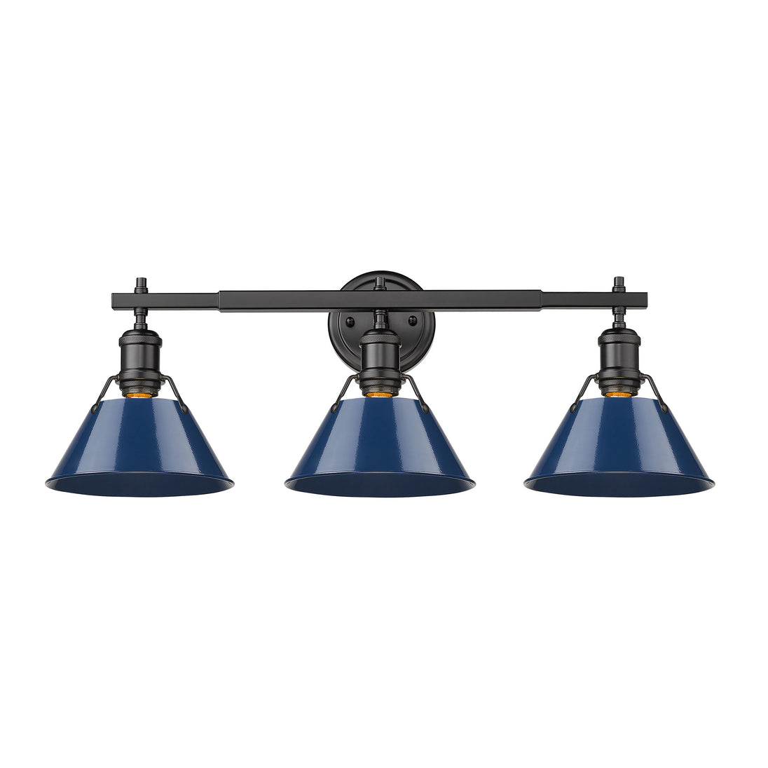 Bring industrial elegance into your home with the Yep by Golden Lighting Orwell 3-light Vanity. Featuring a metal shade and a matte black frame, it creates a welcoming atmosphere. The navy blue metal shade not only adds a classic touch but also reflects light beautifully, giving your bathroom a sophisticated edge. With its matte black finish, this vanity light offers timeless versatility that suits any modern or traditional décor. Perfect for brightening bathrooms, the fixture is damp location rated—ideal for spaces with occasional moisture. Requires installation but is suitable for covered areas like bathrooms or laundry rooms. Overall dimensions are 27.25"W x 9.88"H x 8.5"D, and it requires 3 E26 medium base bulbs (not included), with a maximum wattage of 100 per bulb. Elevate your space with the striking design and high-quality craftsmanship of this distinctive fixture.