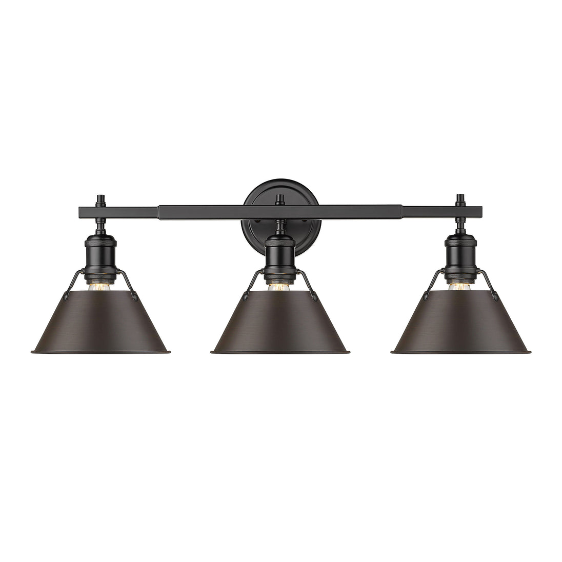 Bring industrial elegance into your home with the Yep by Golden Lighting Orwell 3-light Vanity in Matte Black and Rubbed Bronze. Featuring a rubbed bronze shade and a matte black frame, it creates a welcoming atmosphere. The rubbed bronze metal shade enhances light diffusion, providing a warm, inviting glow that complements traditional and contemporary settings. Its classic style ensures versatility in various decor. Ideal for covered and semi-enclosed spaces, this fixture is excellent for bathrooms, covered porches, and laundry rooms. Requires three E26 Medium base bulbs, with a maximum wattage of 100 per bulb, and measures 27.25"W x 9.88"H x 8.5"D, making it a practical and stylish choice for your vanity needs. Elevate your space with high-quality craftsmanship and timeless design.